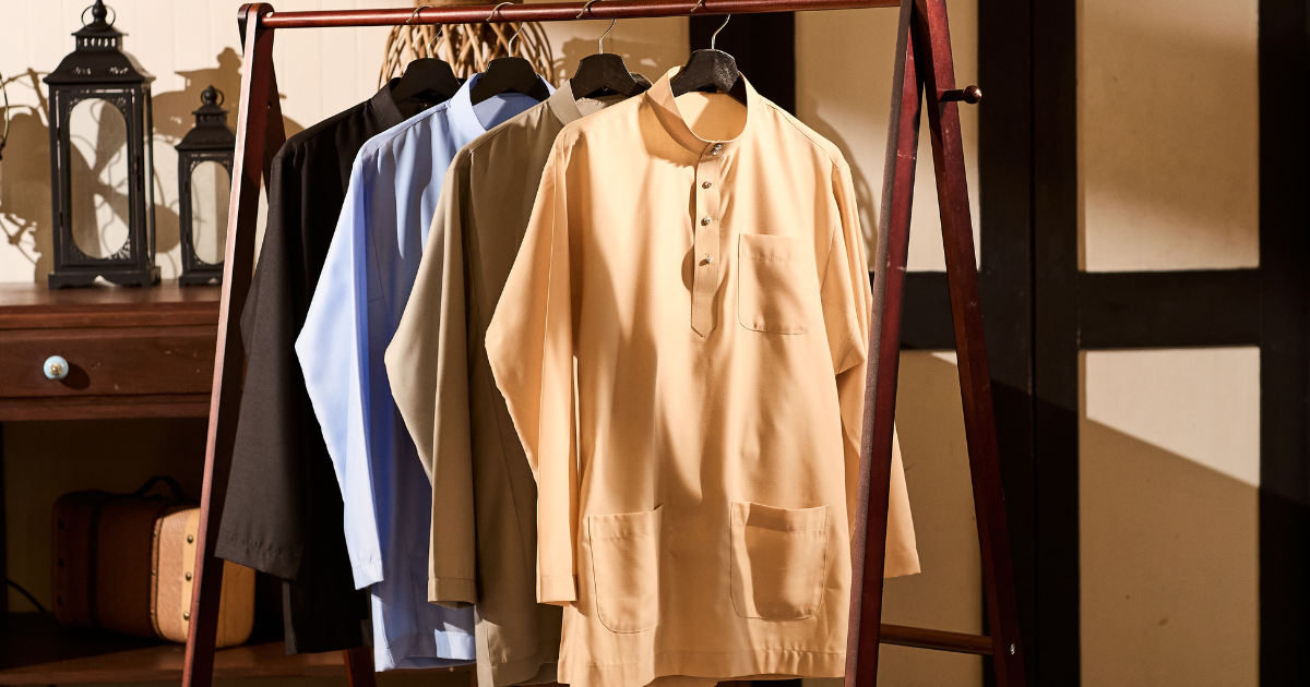 Classic Cekak Musang neckline with a structured collar and engraved alloy buttons